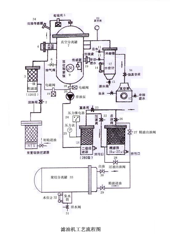1、首先將所有閥門關(guān)閉,然后打開總電源,啟動(dòng)真空泵(17),打開(16),當(dāng)真空泵達(dá)到-0.09Mpa后,停(17),(5) ,(18), 電磁閥(19)自動(dòng)打開,此時(shí)打開初始進(jìn)油閥(1),進(jìn)油閥(2)過(guò)閥(22)過(guò)濾出油閥,精濾進(jìn)油閥(29)出油(30),這時(shí)才能啟動(dòng)排油泵20)輸去油液進(jìn)入聚結(jié)分離階段。