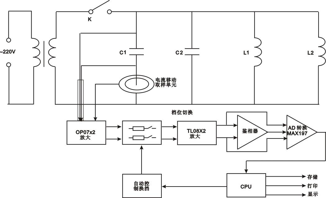 在被測(cè)電容支路有對(duì)被測(cè)電容的電壓、電流取樣的取樣電路,取樣電路的輸出端分別接放大電路,從電壓放大電路輸出的電壓信號(hào)和從電流放大電路輸出的電流信號(hào)通過鑒相器輸出相位差信號(hào),與電壓信號(hào)和電流信號(hào)通過A/D轉(zhuǎn)換器后,輸入CPU計(jì)算而得到被測(cè)電容值。因?yàn)椴捎昧艘苿?dòng)的電流取樣單元,而使得無需拆除連接線就可以直接測(cè)量電容值。