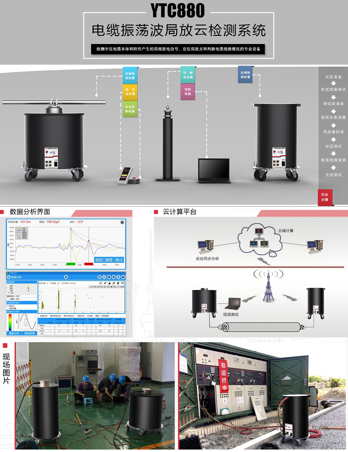 基于阻尼振蕩波的電纜局放檢測方法具有供電容量小、測試時間短、現場操作方便、對電纜本體無損傷等顯著特點,可預先發現缺陷并對缺陷準確定位,是電纜局放診斷方法之一。新一代YTC880電纜振蕩波局部放電檢測系統系列產品,用于檢測10千伏中壓電纜本體和附件產生的局部放電信號、定位局放點和判新電纜絕緣情況。獨創的異步和同步雙端檢測方法對長距離、高衰減電纜效果顯著。同時,利用云計算平臺建立的電纜故障庫,采用智能算法進行電纜狀態實時評價,能大幅度提高局放檢測的準確性
