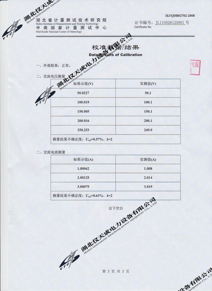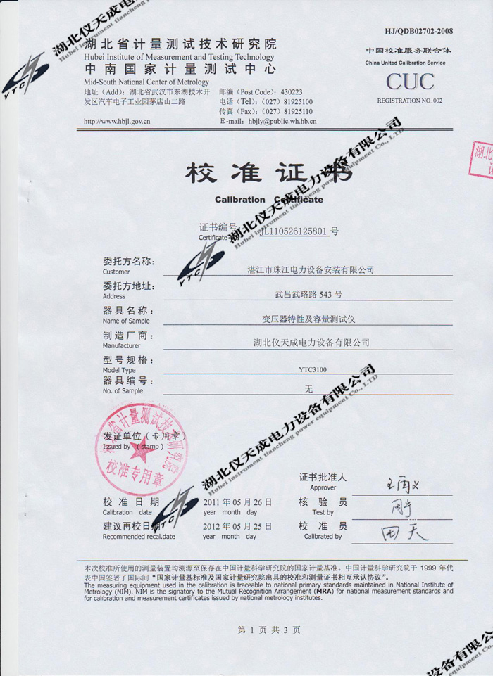 轉(zhuǎn)載:"YTC3100變壓器特性及容量測(cè)試儀的資質(zhì)證書(shū)" 請(qǐng)注明來(lái)源于儀天成電力。 更多技術(shù)問(wèn)題請(qǐng)致電儀天成電力客戶(hù)服務(wù):027-87876585,技術(shù)部專(zhuān)線:027-87876585,在線客服:719388481