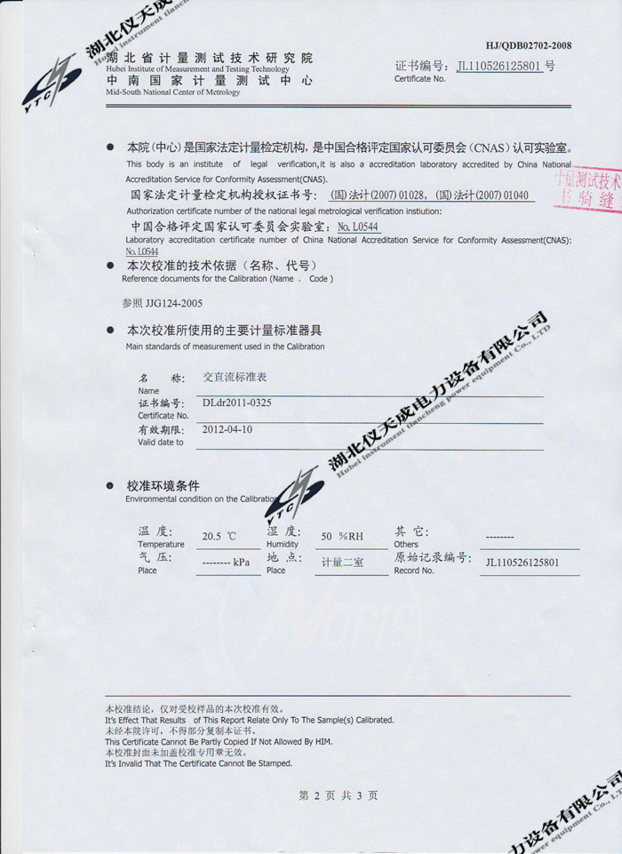 YTC3100變壓器特性及容量測(cè)試儀的資質(zhì)證書(shū)
