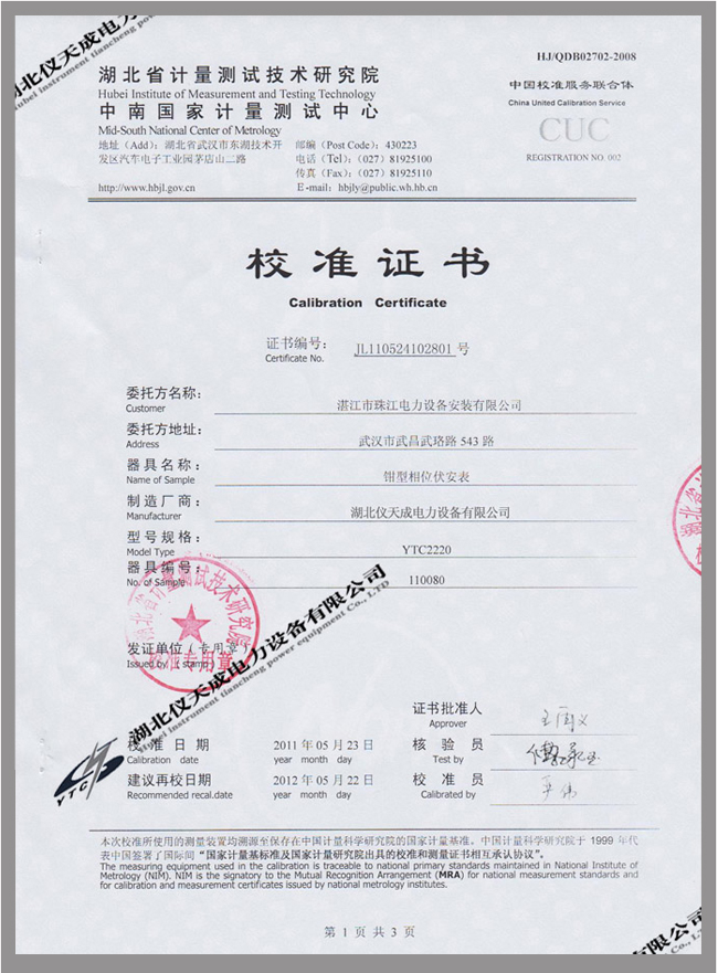轉(zhuǎn)載:"YTC2220數(shù)字雙鉗相位伏安表鑒定證書" 請(qǐng)注明來源于儀天成電力。 更多技術(shù)問題請(qǐng)致電儀天成電力客戶服務(wù):027-87876585,技術(shù)部專線:027-87876585,在線客服:
