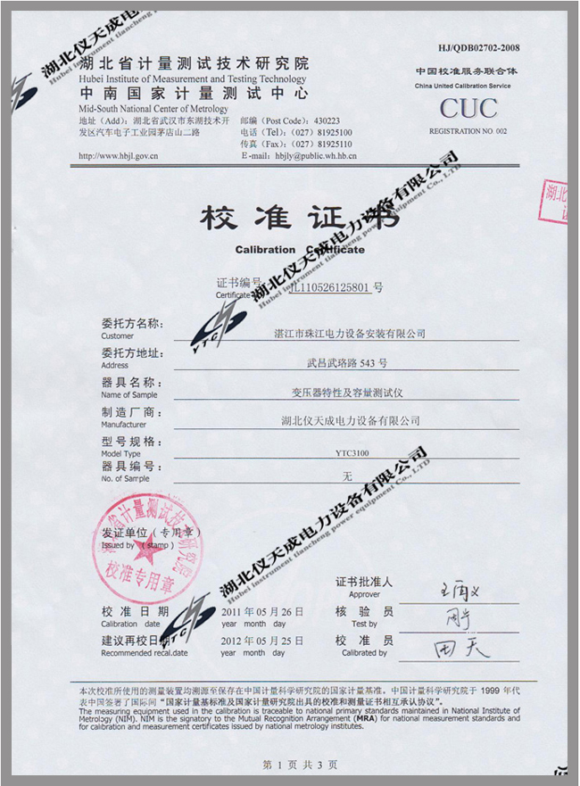轉載:"YTC3100變壓器容量及損耗參數(shù)測試儀鑒定證書" 請注明來源于儀天成電力。 更多技術問題請致電儀天成電力客戶服務:027-87876585,技術部專線:027-87876585,在線客服:719388481