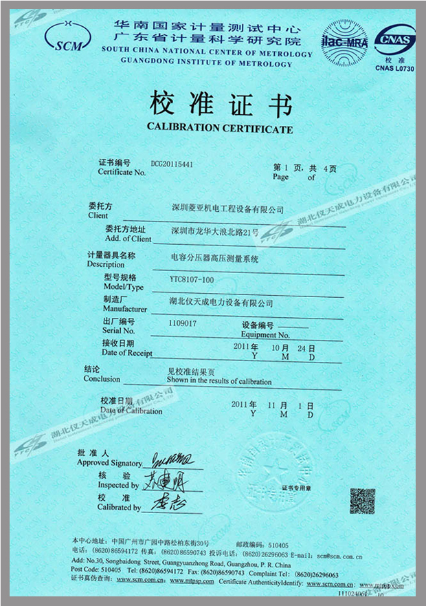 轉(zhuǎn)載:"YTC8107系列電容分壓器高壓測(cè)量系統(tǒng)鑒定證書(shū)" 請(qǐng)注明來(lái)源于儀天成電力。 更多技術(shù)問(wèn)題請(qǐng)致電儀天成電力客戶服務(wù):027-87876585,技術(shù)部專線:027-87876585,在線客服:
